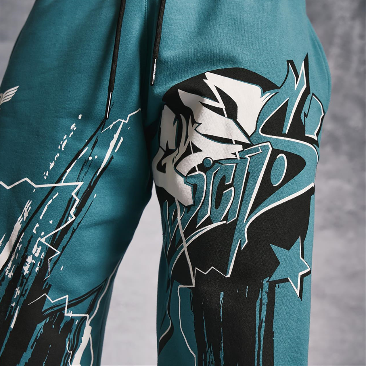 Φαρδιά φόρμα σε πετρόλ χρώμα. Το σχέδιο ξεχωρίζει για τα εντυπωσιακά grunge all-over τυπώματα και τον μοναδικό χρωματικό συνδυασμό του. Μπορεί να συνδυαστεί εύκολα με όλα τα καθημερινά σας look ή τα outfit γυμναστηρίου. Συνδυάστε την με μπλούζες ή ζακέτες Evolution Body και τα αγαπημένα σας sneakers και δημιουργήστε ένα sporty casual στιλ που θα ξεχωρίσει.