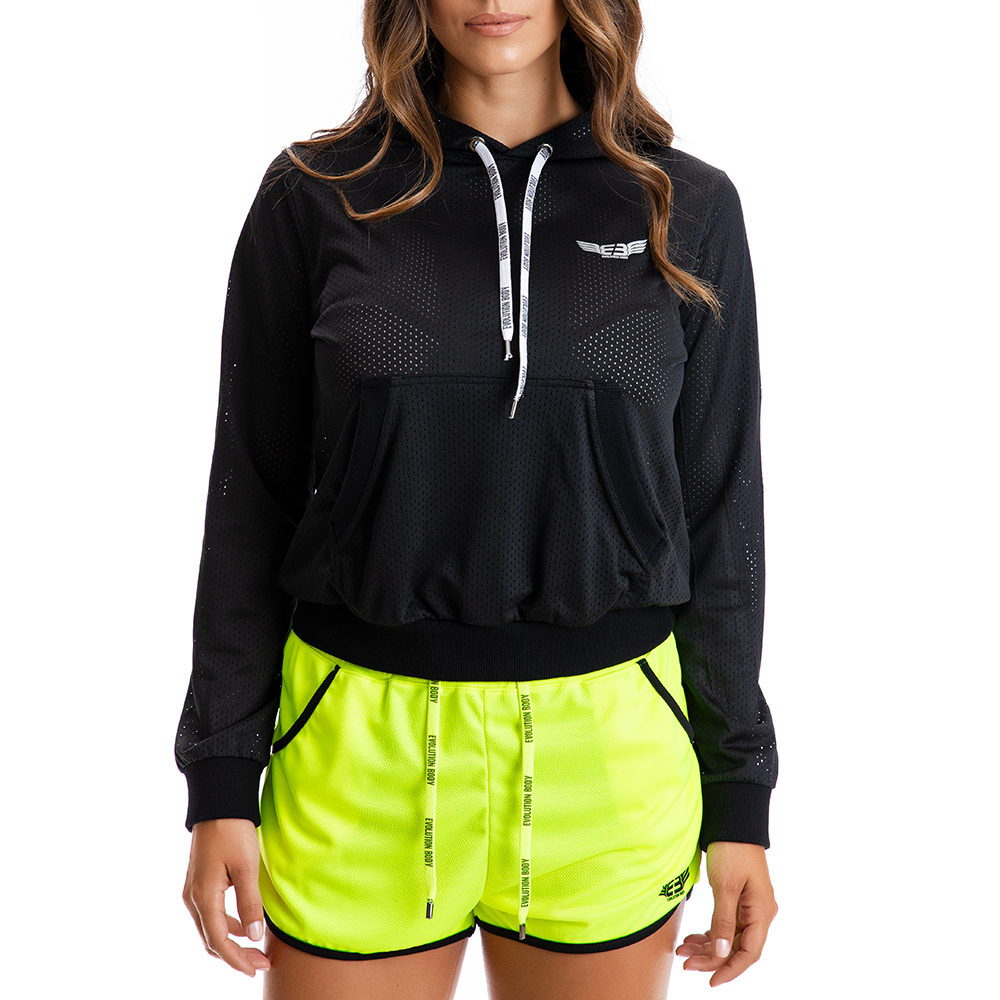 Μαύρη μπλούζα με κουκούλα και τρυπητό ύφασμα διπλής πλέξης που προσδίδει μία τρισδιάσταστη αίσθηση της υφής. Στιλάτο, άνετο και ευκολοσυνδύαστο ρούχο που μπορεί να συμπληρώσει άψογα τα γυμναστηριακά ή καθημερινά outfits. Συνδυάστε το με φόρμες ή κολάν Evolution Body για το απόλυτο sport look.