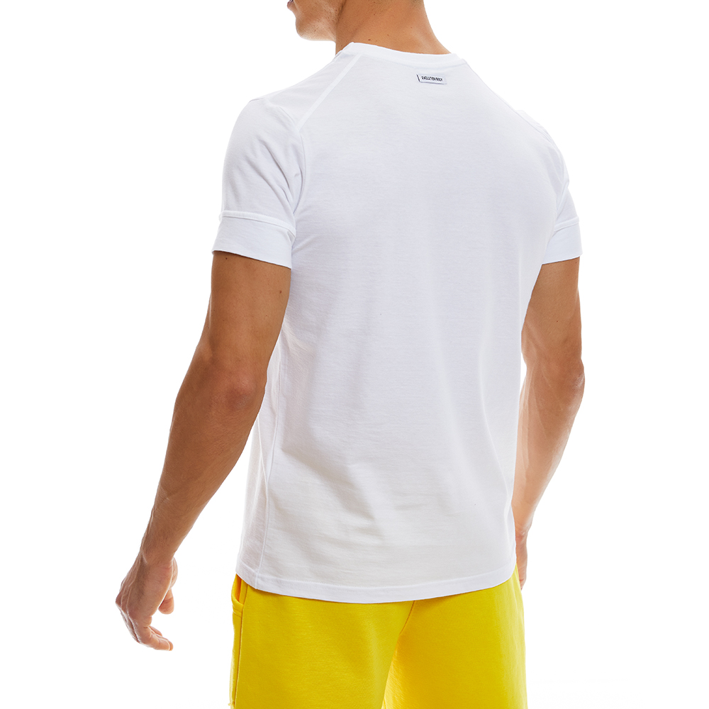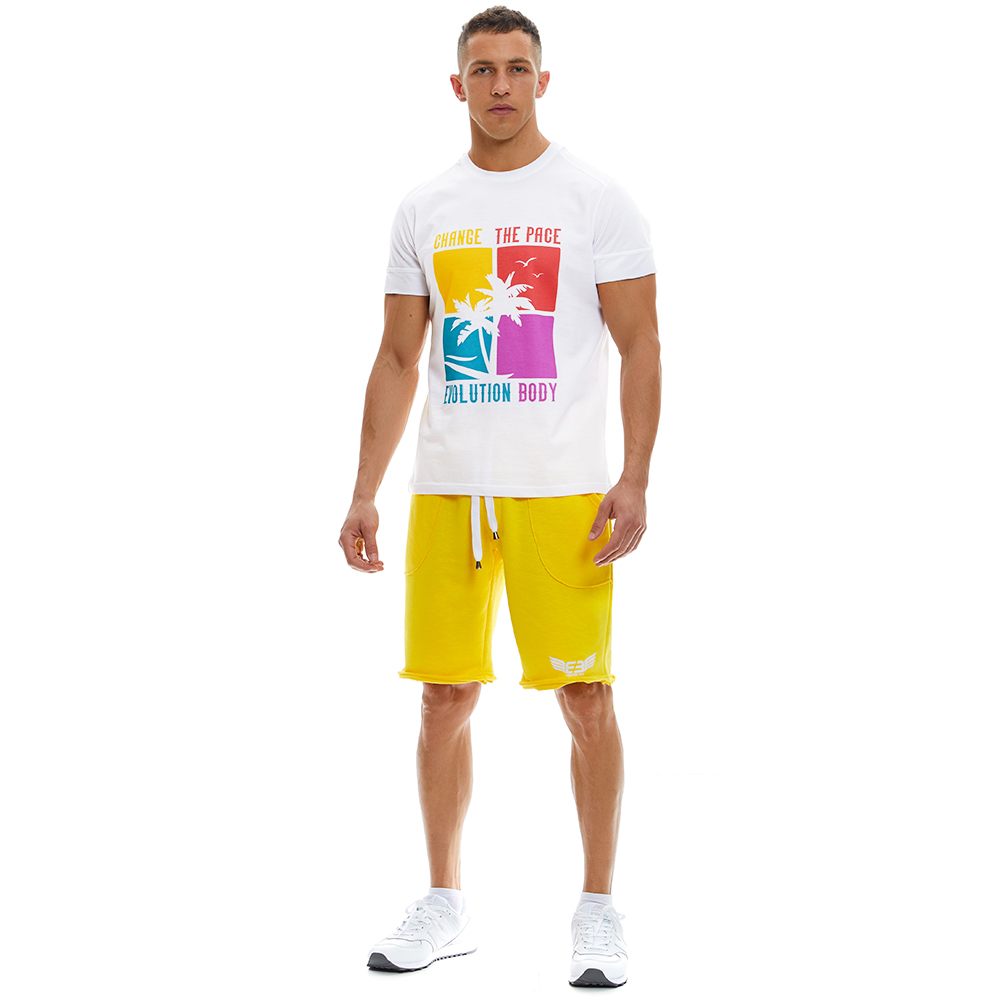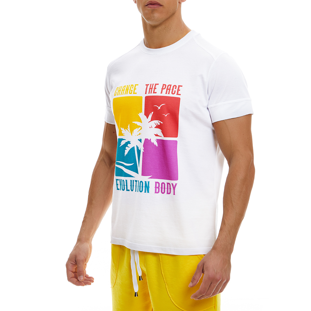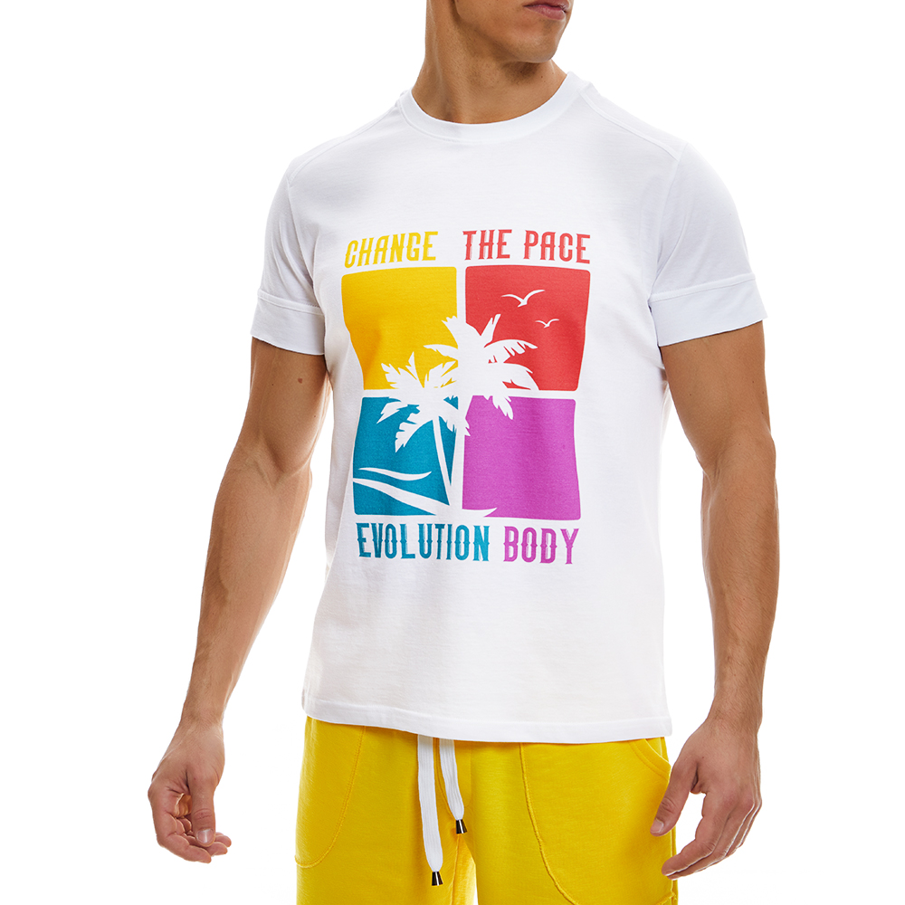 Αν θέλεις την απόλυτη άνεση του t-shirt σε συνδυασμό με κομψή σχεδίαση, δώσε πόντους στο στιλ σου με τα μοναδικά σχέδια της Evolution Body. Λευκό t-shirt με τύπωμα σε έντονα καλοκαιρινά χρώματα που θα ταιριάξει με τις χρωματιστές βερμούδες μας για την παραλία καθώς και όλα τα καθημερινα,αθλητικά σας outfits.