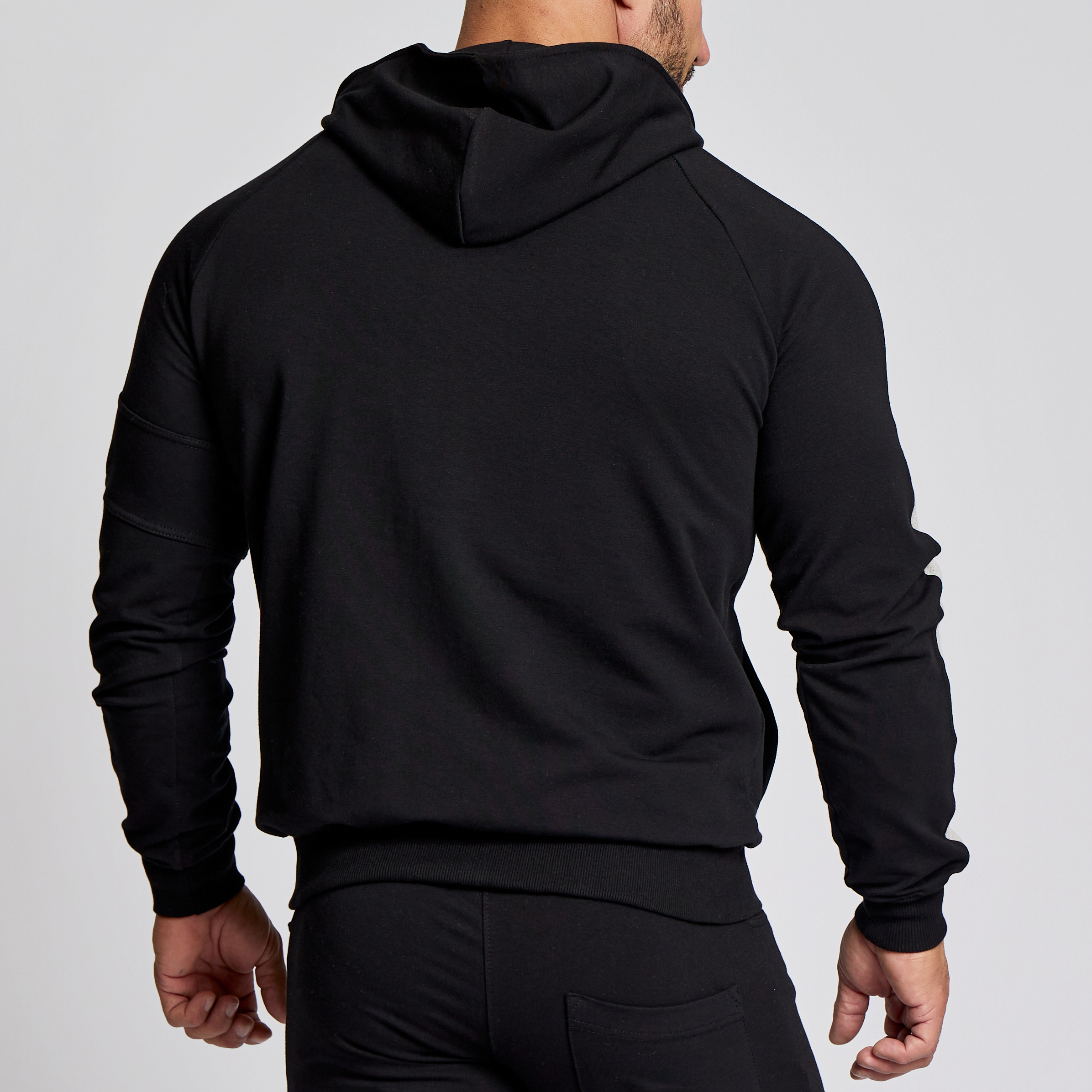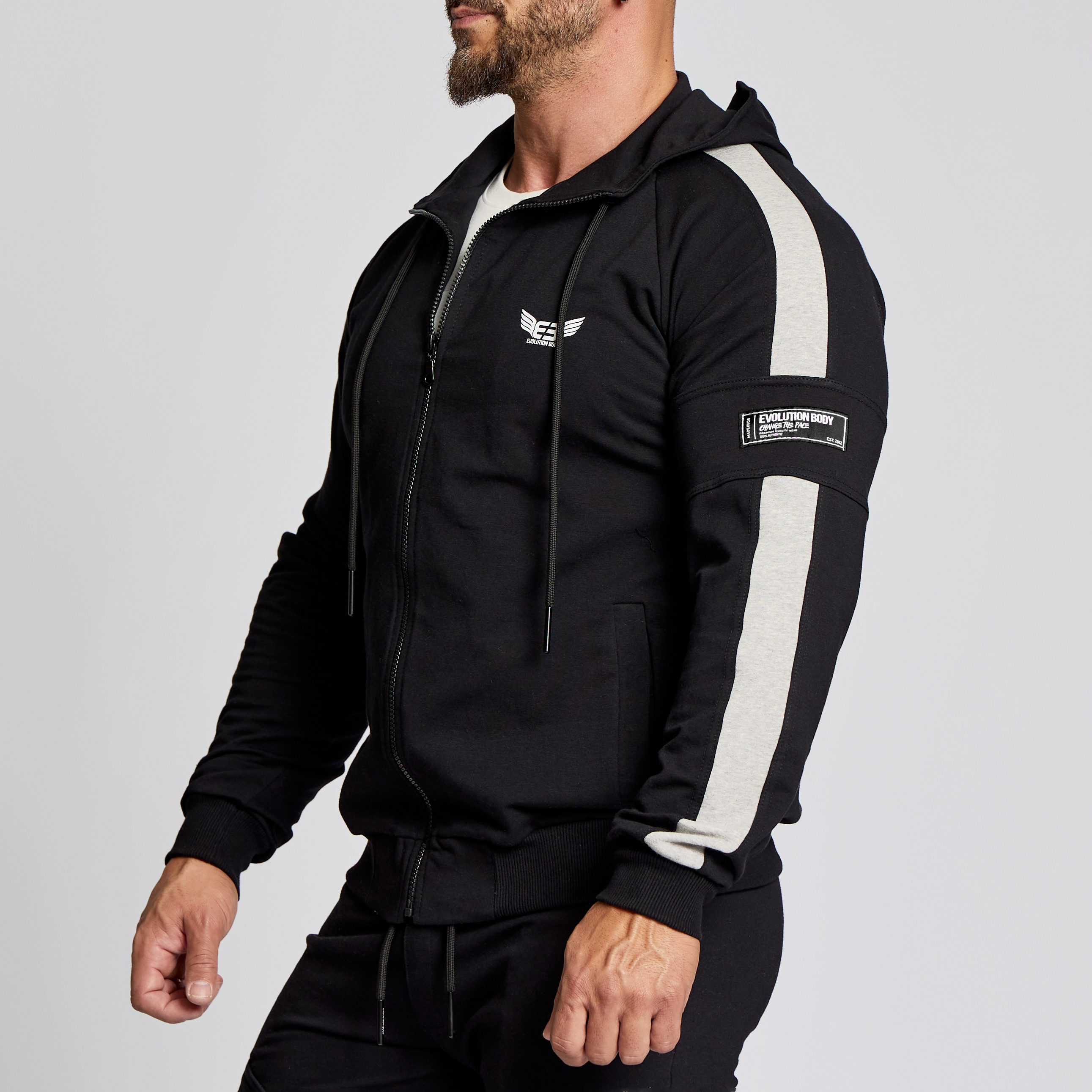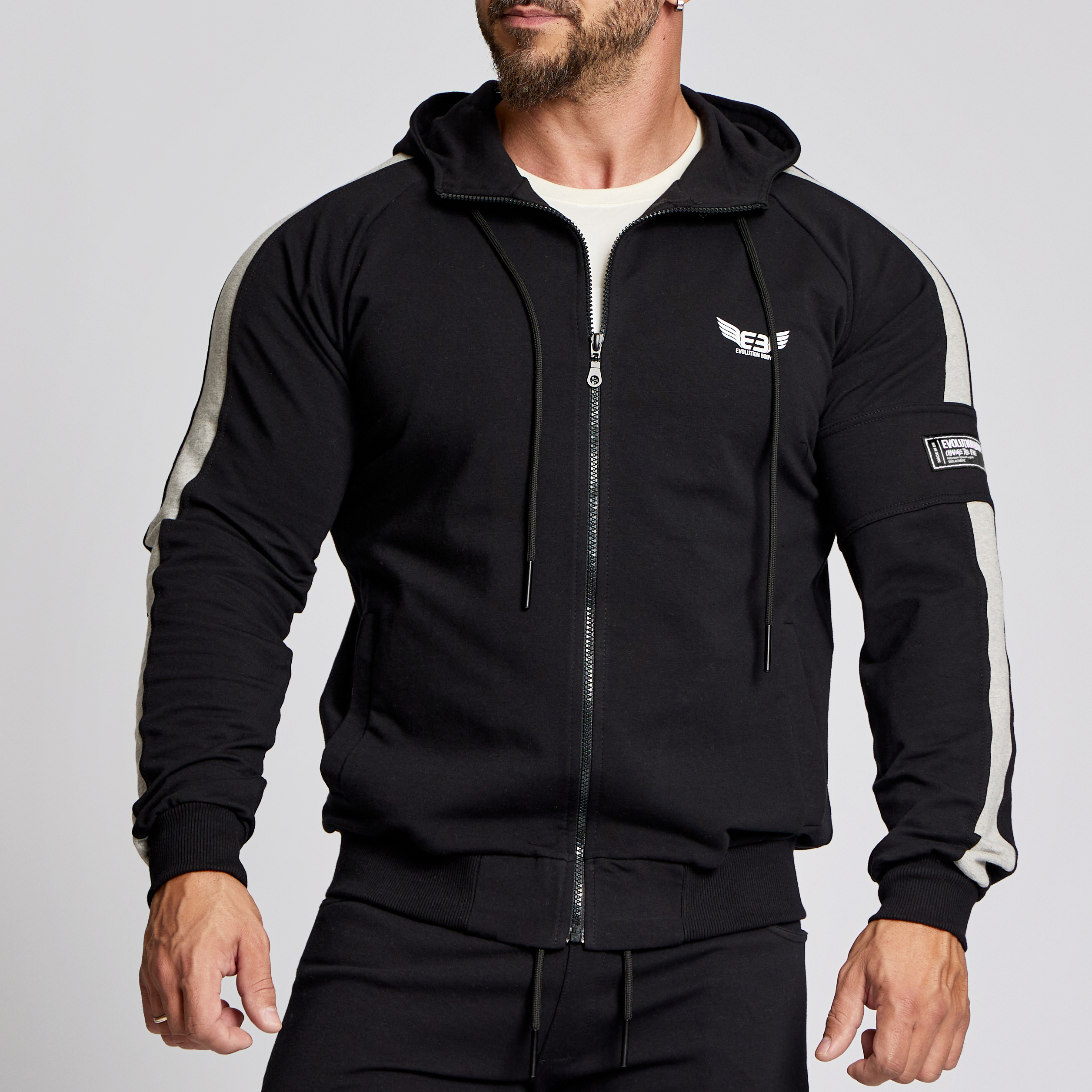 Μαύρη ελαστική ζακέτα με κουκούλα που για το απόλυτο sport look όταν η θερμοκρασία αρχίζει να πέφτει.Η ζακέτα χαρακτηρίζεται από τη slim fit γραμμή της που αγκαλιάζει και αναδεικνύει το σώμα. Ιδανική επιλογή για καθημερινές εμφανίσεις όταν η θερμοκρασία αρχίζει να πέφτει.