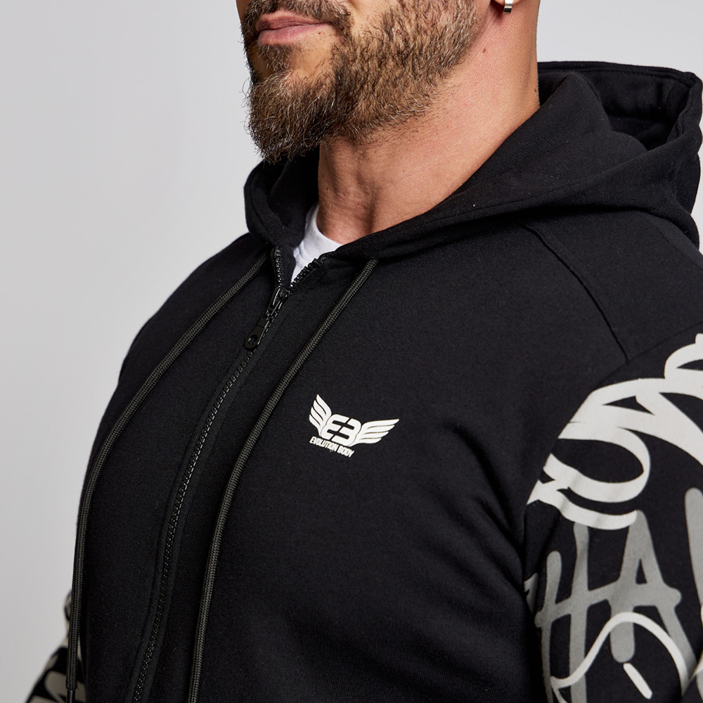 Μαύρη βαμβακερή ζακέτα με κουκούλα που για το απόλυτο sport look .Η ζακέτα χαρακτηρίζεται από τη slim fit γραμμή της που αγκαλιάζει και αναδεικνύει το σώμα. Ιδανική επιλογή για καθημερινές εμφανίσεις.